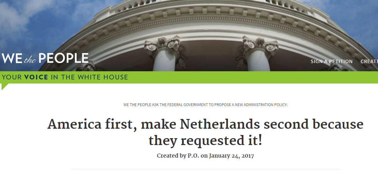 Naar aanleiding van de Trump video van Arjen Lubach is er een petitie opgestart om het Witte Huis op te roepen The Netherlands daadwerkelijk ook ‘second’ te maken.