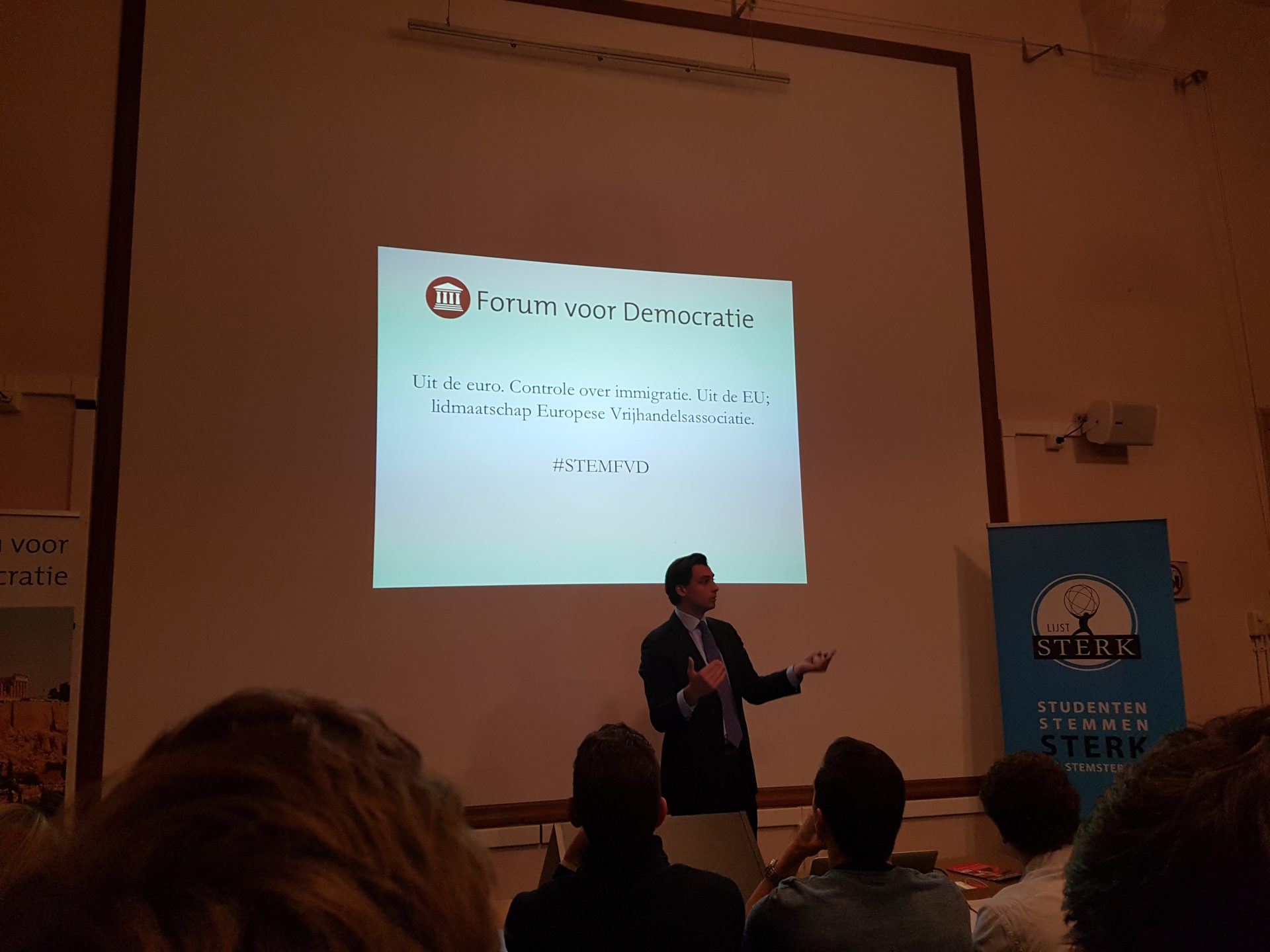 Thierry houdt eerst een peiling en vraagt hoeveel mensen zeker op FvD zullen stemmen. Tien handen gaan de lucht in, evenveel bij de vraag wie zeker niet FvD gaat stemmen.